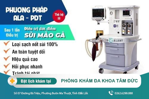 – Quang động lực ALA-PDT là một phương pháp tiên tiến để điều trị sùi mào gà ở hậu môn đang được sửa dụng tại Phòng Khám Đa khoa Tâm Đức (Số 07 Đường Bà Triệu, Phường Buôn Ma Thuột, Tỉnh Đắk Lắk). Khác với những phương pháp truyền thống, phương pháp này có thể khắc phục hoàn toàn những nhược điểm mà các phương pháp truyền thống để lại.